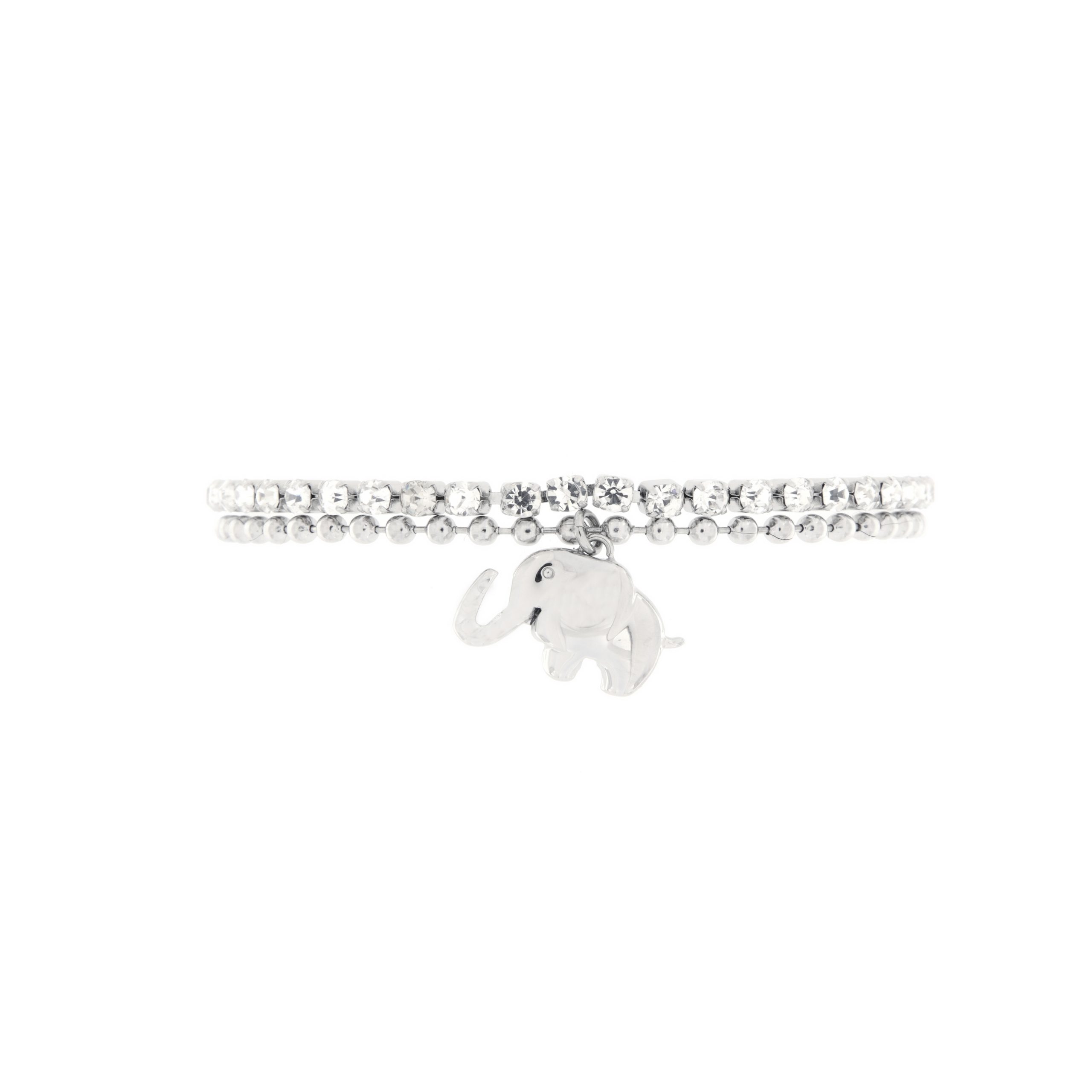 Bracciale doppio in acciaio 316L ipoallergenico con finitura lucida, ciondolo ad elefantino e strass bianco