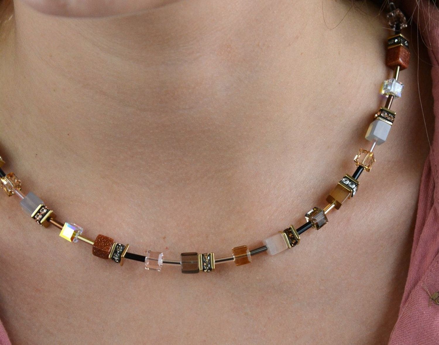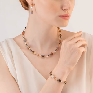 Collana GeoCUBE® Iconic Precious marrone Il mix di cognac, marrone e tonalità nude rende questo design GeoCUBE® particolarmente ricercato e perfetto per un’apparizione di stile e alla moda. Realizzazione a mano con vere pietre naturali .