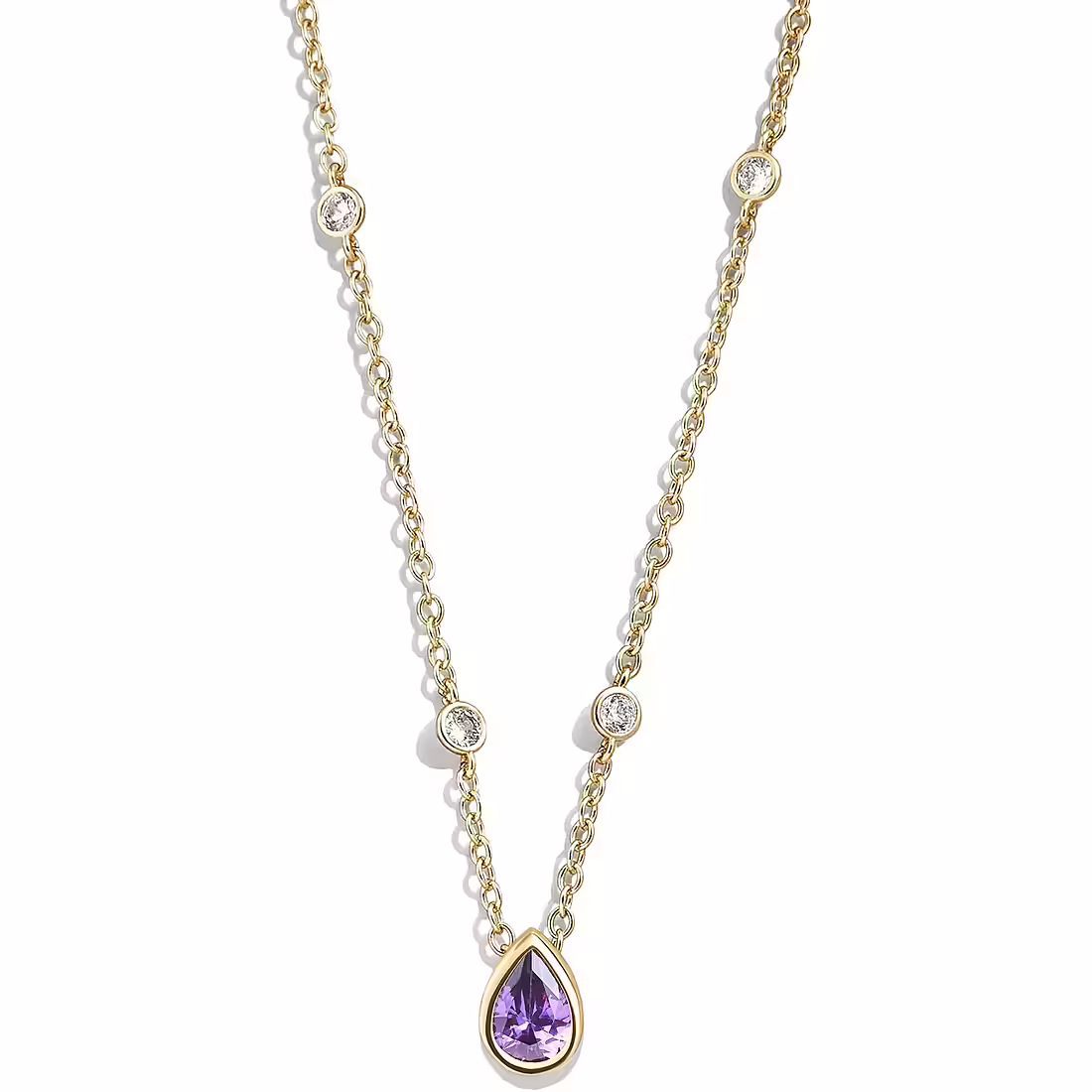 Il fascino del viola intenso illuminato da piccoli cristalli incastonati lungo la catena dorata in oro giallo.