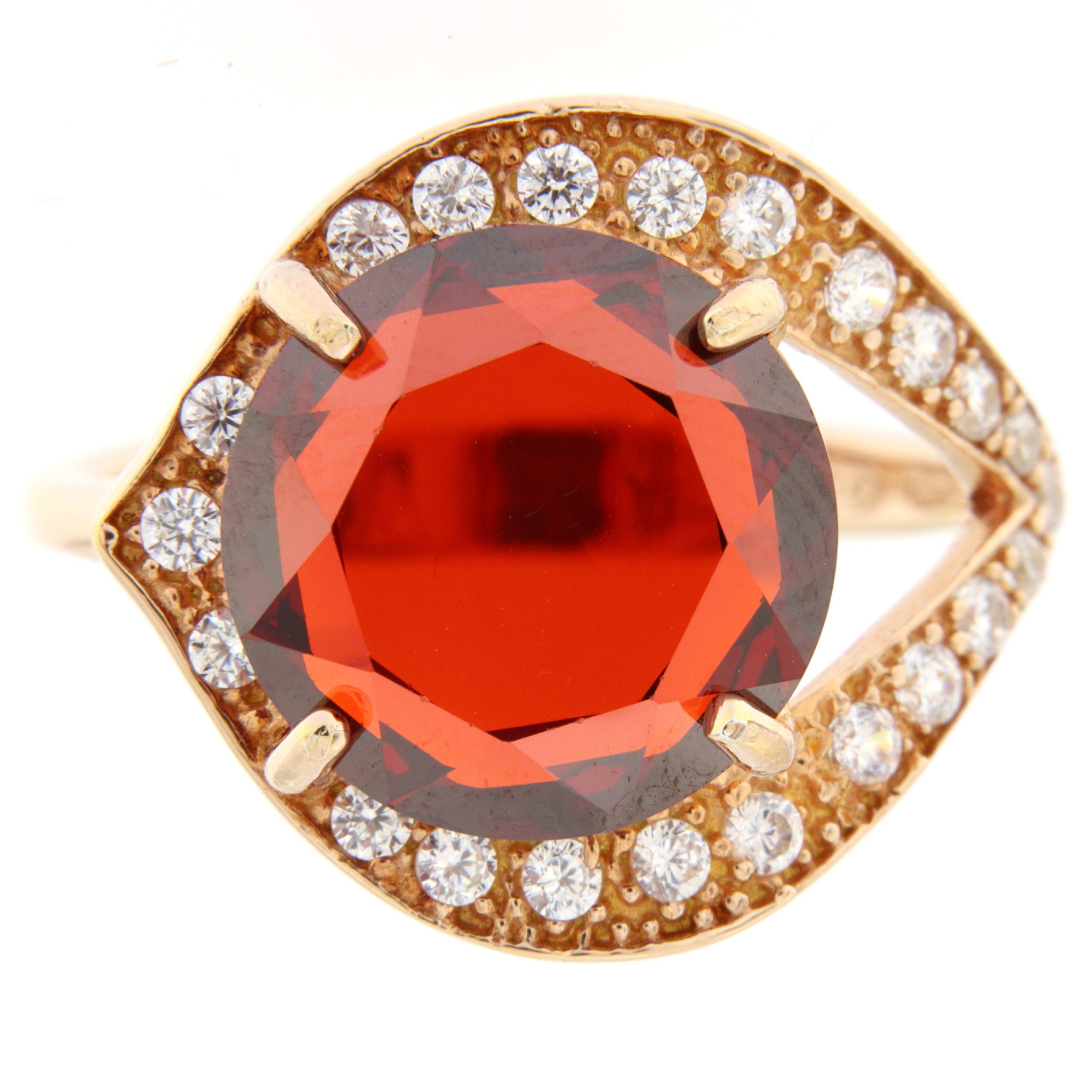 Anello in argento 925/1000 dorato oro rosa con grande zirconia cubica tinta granato e zirconia cubica bianca taglio a brillante.
